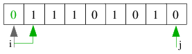 dessen gerade betrachtetes Bit 1 ist. Der rechte Zeiger steht zu Beginn auf dem Ende der Folge und durchläuft