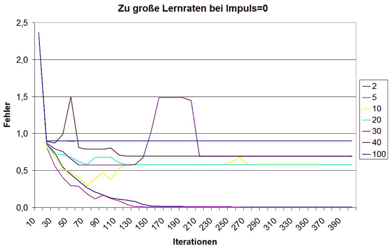von einem Finden des Minimums der Fehlerfunktion kann keine Rede mehr sein. Man sieht also, dass zu hohe